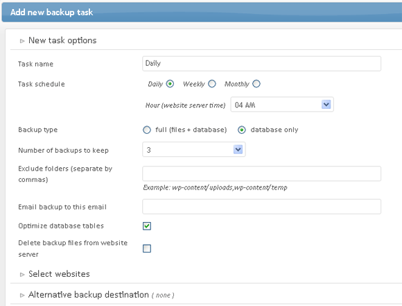 Options include backup schedule, number of backups to keep, folders to exclude, do you want the backup to be sent to your email and finally whether to delete the backup file from the server (useful if you have external backup destination like Dropbox).