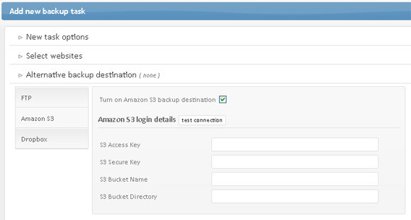 By default backups are created on your server, but if you want to store them on an external destination you can specify the details for an external FTP, Amazon S3 or Dropbox.