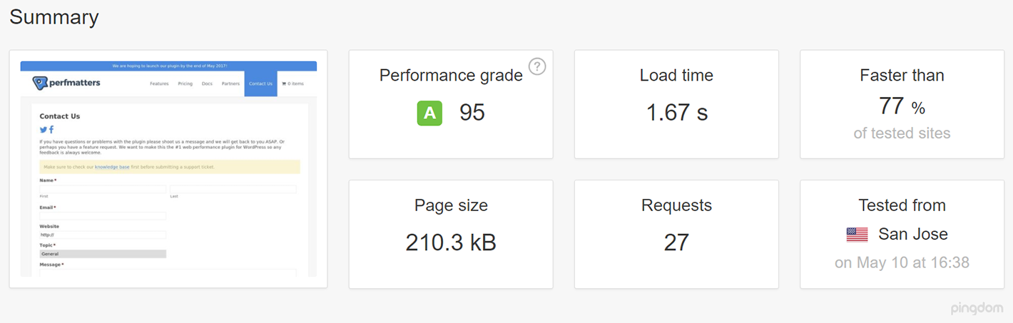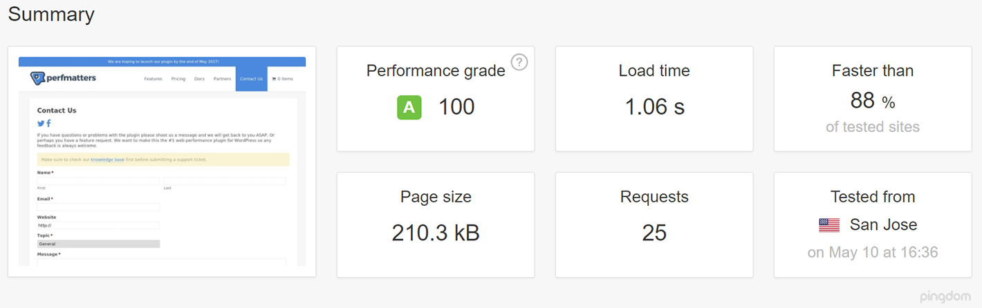 Recently, Kinsta ran a test on WordPress to better understand how redirects affect page speed. They used Pingdom to complete a page speed report without a redirect. The page loaded in just 1.06 seconds.