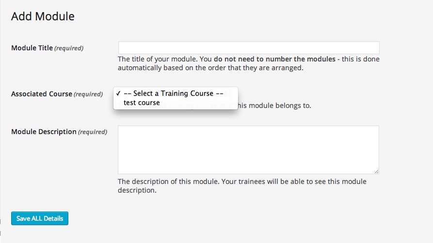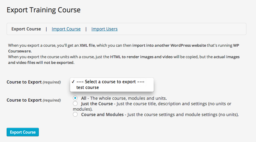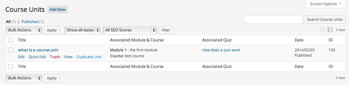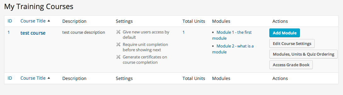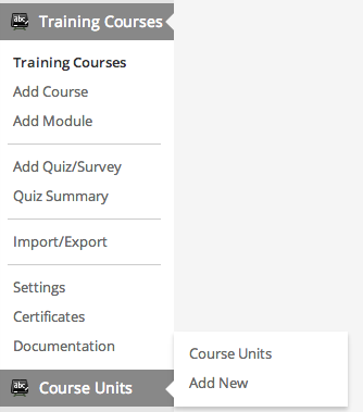 Courses and Modules are under the same menu in the WordPress Dashboard. Modules don’t really do much except give a description to a set of Units. They can be thought of like “Unit sets.”