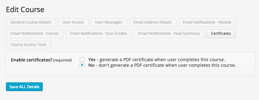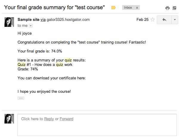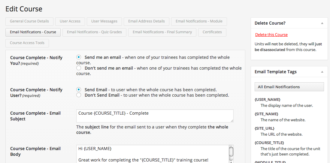 WP Courseware sends e-mails to students and teachers when milestones are reached (such as completing a course or passing a quiz). E-mails can contain quiz grades, cumulative course grades and links to download a certificate of completion, among others. These are controlled by “E-mail Template Tags” easily accessible in the Course Settings.