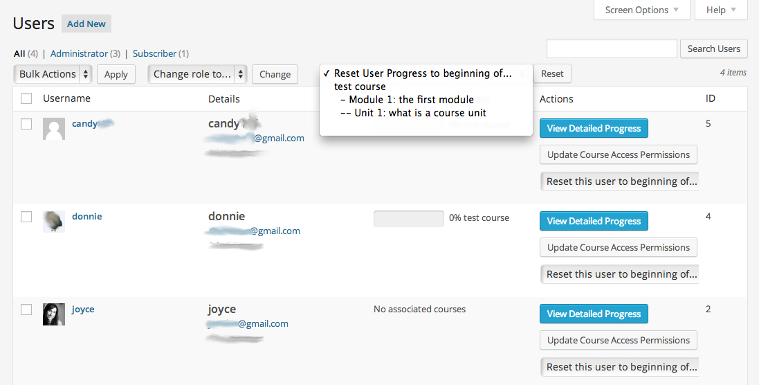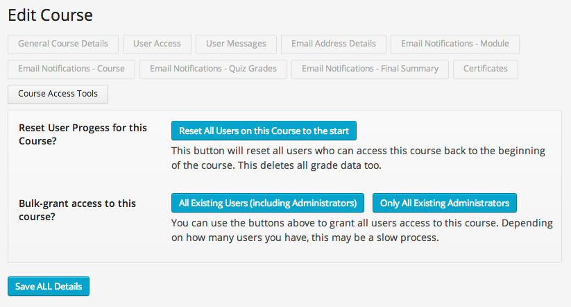 Existing WordPress users can be individually added to a Course or be revoked from a Course. Users can be individually or collectively set back to the beginning of a Course, Module or Unit. These functions are added to the “Users” menu of WordPress.