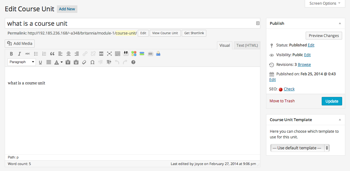 Units are a Custom Post Type. In other words, they ‘look’ just like the Post and Page editor in the WordPress back end, except there are no categories, tags, ordering options or featured images. This is a very simplified editor without custom fields, author boxes, or much other than the basics. The only major option you’ll have here is to choose a template based on a file that you previously coded (techno-phobes need not apply).
