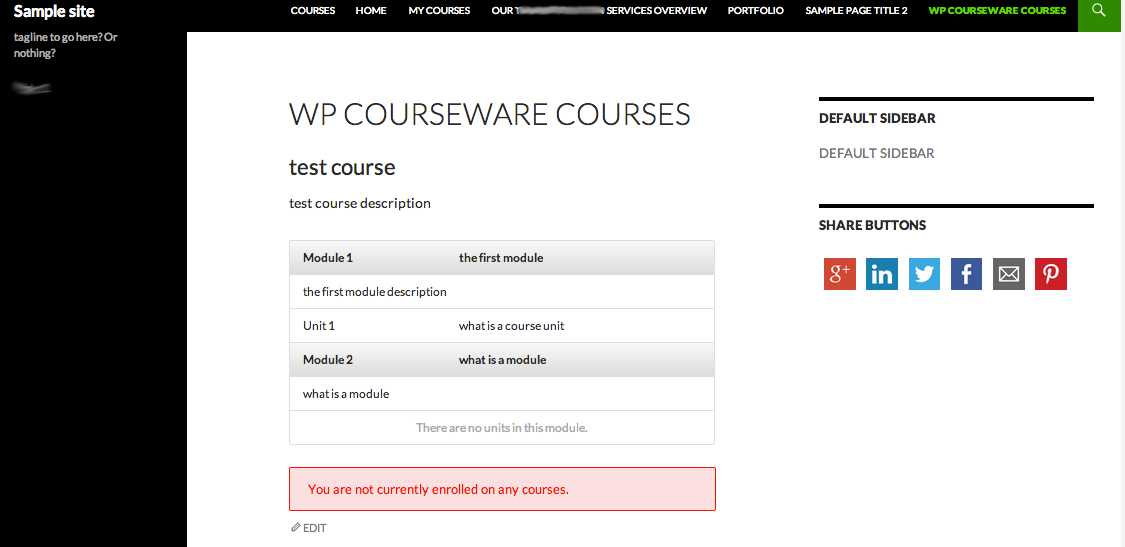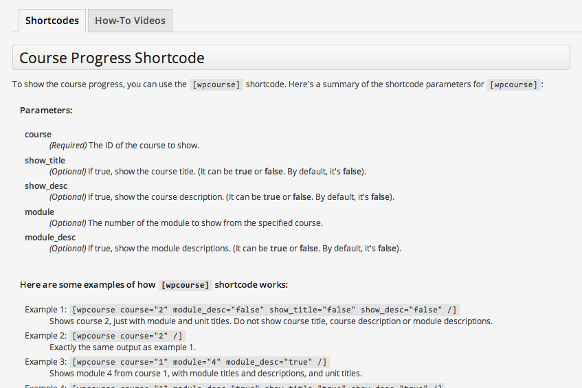 This shortcode usage can come in handy because it allows course information to be displayed within a pre-defined div (such as the ‘regular’ content area of a WordPress Page). This can mean less coding work with theming and templating.