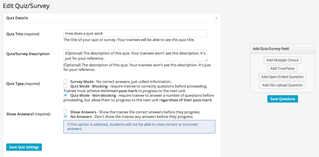 Options for Quizzes are extensive. For example, they can be in “Survey Mode” where there are no correct answers. They can require a minimum passing mark to progress to the next Unit, they can show correct answers before progression, show what was inputted, and explain the answer. They can also be viewed later. These are options, so you can turn them off to prevent class cheating.