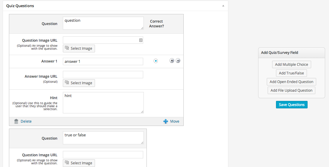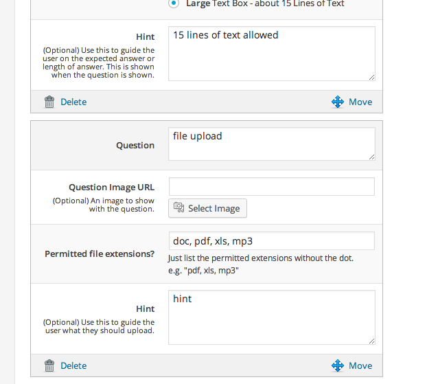 Quizzes can be multiple choice, true or false, open ended or graded through a file upload.
