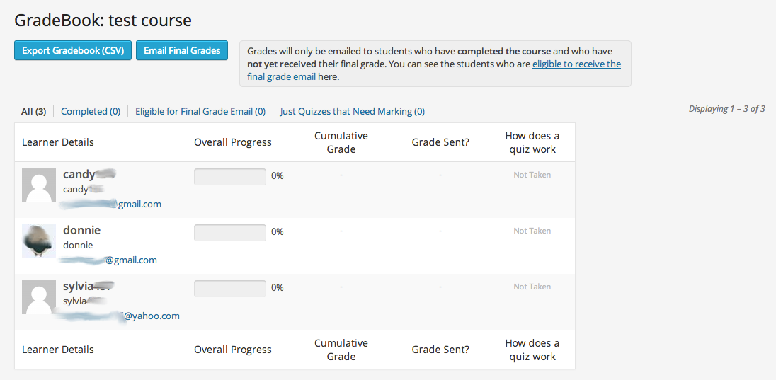 Each course has a “Grade Book” area where teachers can see users enrolled in specific courses. This screen shows students’ progress, grades, quizzes taken, and whether or not they have received their marks. This page also allows for mass e-mailing of final grades to students so long as they have completed the course (this is mainly applicable to quizzes with open ended questions or essays that can’t automate the sending of a final score in the system). The Grade Book can also be exported as a CSV in case teachers need to input information into another school system.
