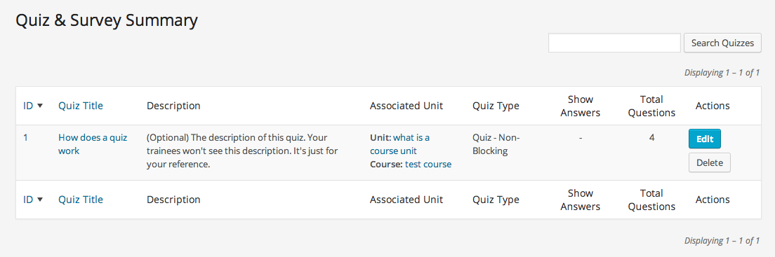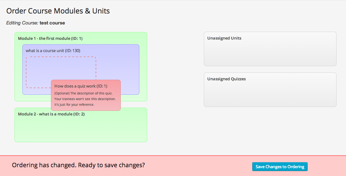 Quizzes go inside Units, but Quizzes are created separately from a different menu. When you work on a Unit, you select from a drop down list what Quiz to add to it. Alternatively you can use their drag and drop interface, which is much easier, but takes a bit of clicking around to find (hint: it’s under “Training Courses” > “Modules, Units & Quiz Ordering”).