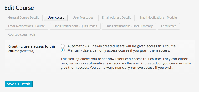 You can give all existing WordPress users bulk access to a Course, or select to only allow all Administrators access.