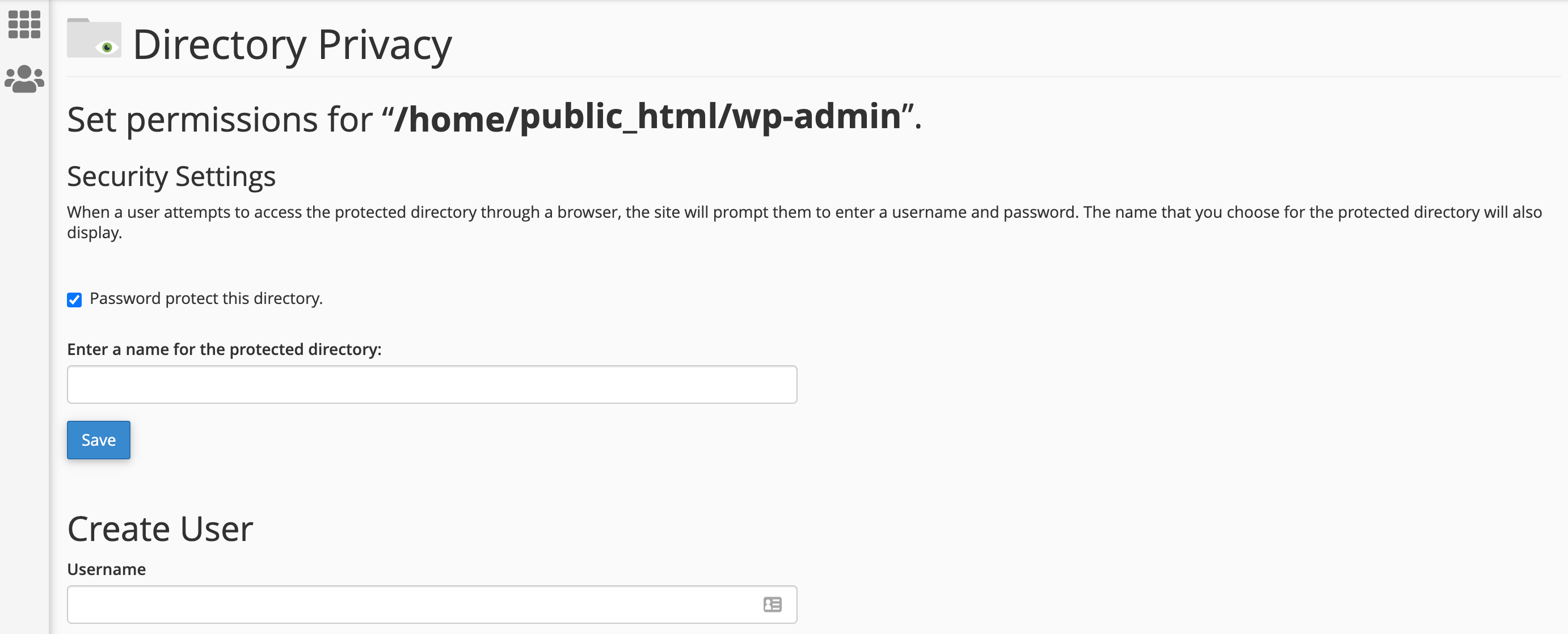 Since we’re talking about protecting a folder that lives on your server, you’ll need to do this through your hosting management panel. In cPanel, for example, you’ll have Directory Privacy, as shown in the images below.