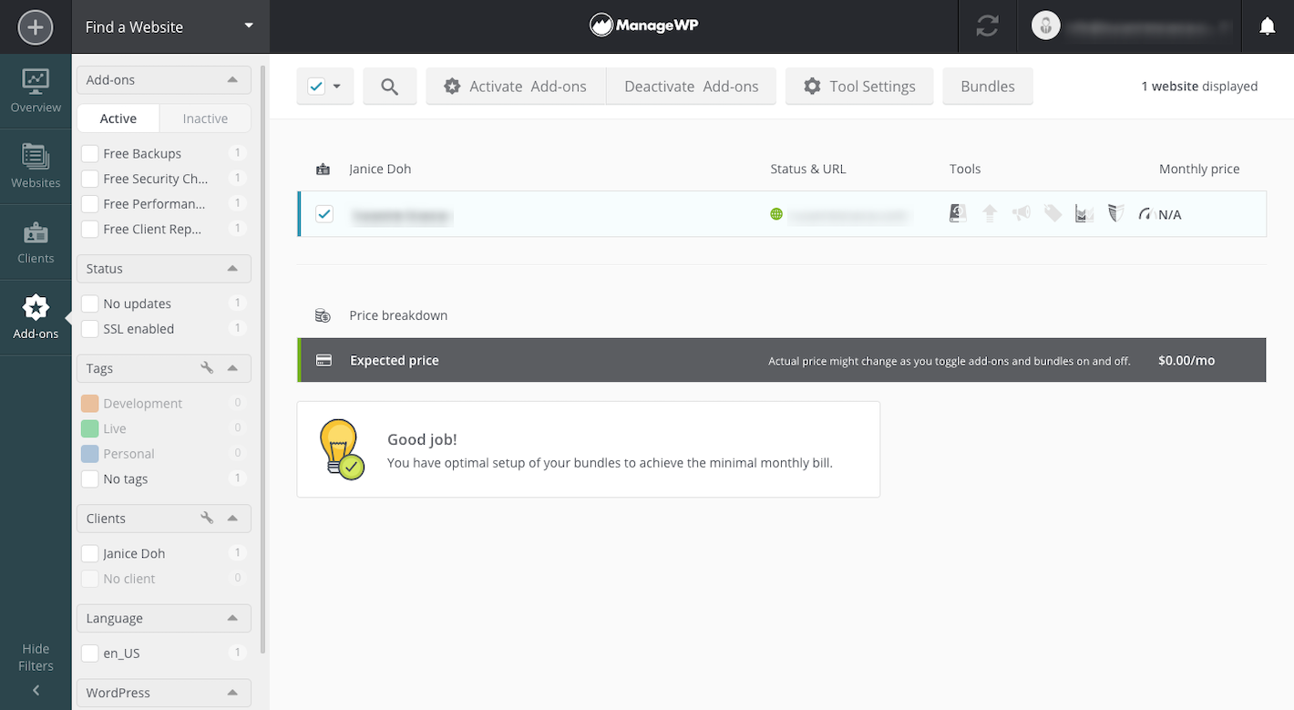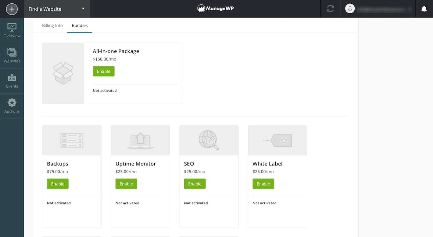The free version of ManageWP is perfect for the freelance WordPress developer or brand new agency wanting to develop and refine their processes. As your client list grows, and as you build more sources of recurring revenue, ManageWP scales with you.