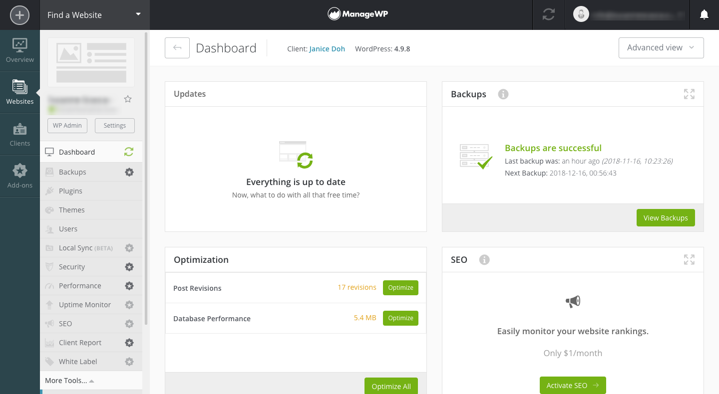Rather than get bogged down in managing updates and security scans on each client website, use ManageWP to optimize, automate, and schedule tasks that don’t require your input. That way, you have more time to work on the tasks that need your attention.