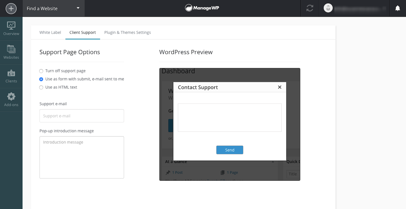 You may also want to activate a Support form. This allows clients to send support requests to you directly from their WordPress installation.