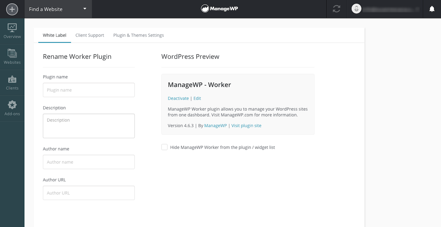 The first tool to use is the white labeling of the ManageWP Worker plugin–or you can hide it altogether from their WordPress installation. This removes any doubts over who actually owns and manages the maintenance of their website: