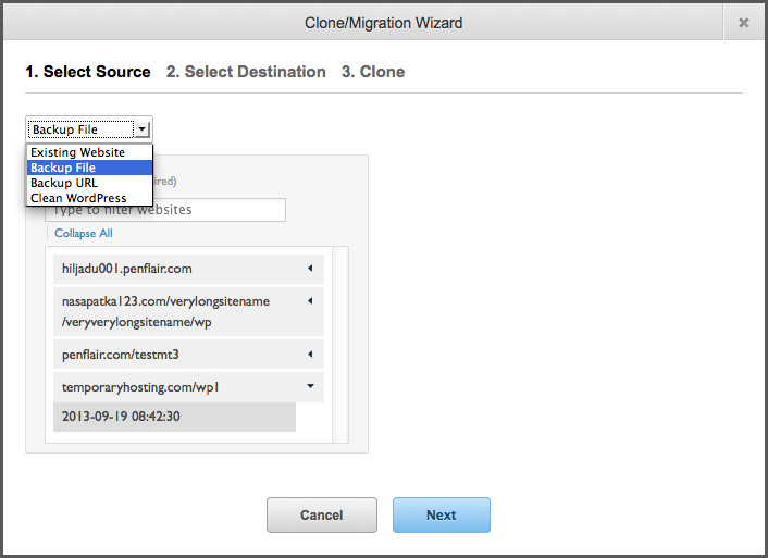 We’ve just released an update to one of our most used features, the Clone/Migration Wizard. We’ve added an option for you to select one of your website backups as a source for cloning. User interface is improved and focused on leading you through three simple steps to complete the process.