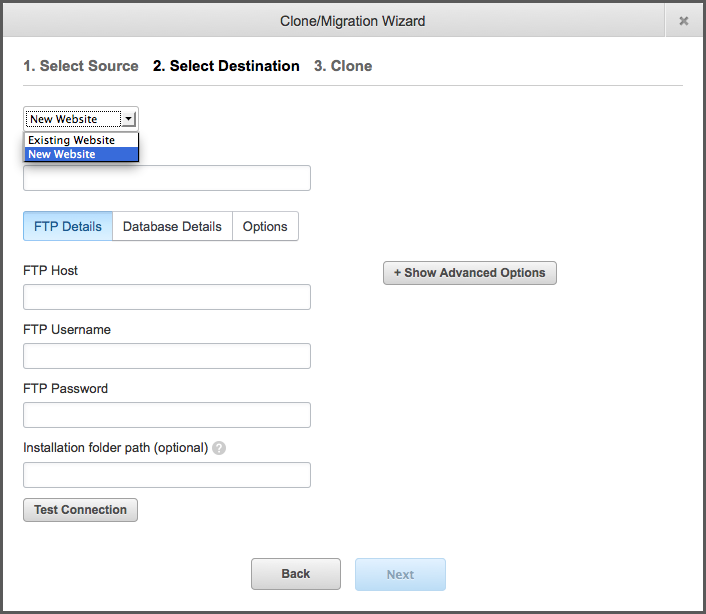 You can clone over an existing website or create a new website (you need to provide FTP and MySQL account details for the latter).