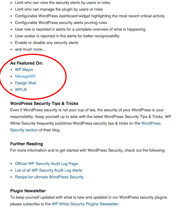 The readme.txt offers numerous other opportunities. One of them is providing social/branding proof for your plugin. Check this creative example on WP Security Audit Log page.