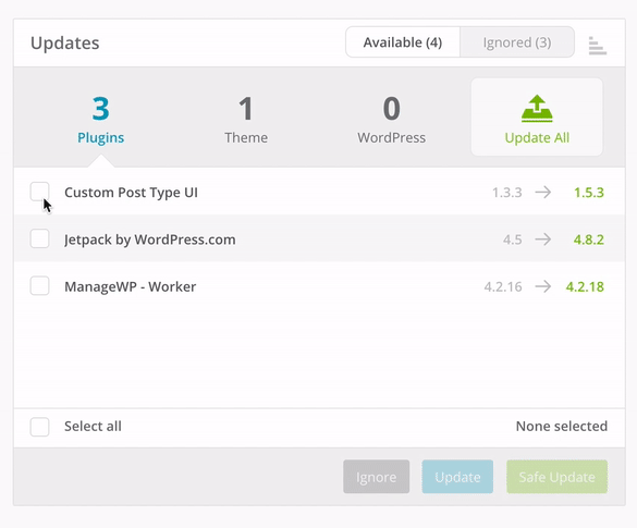Safe Updates is a fantastic new feature that takes the pain out of your update cycles. We built it with the goal of helping you scale updates across dozens of websites. Safe Updates will allow you to: