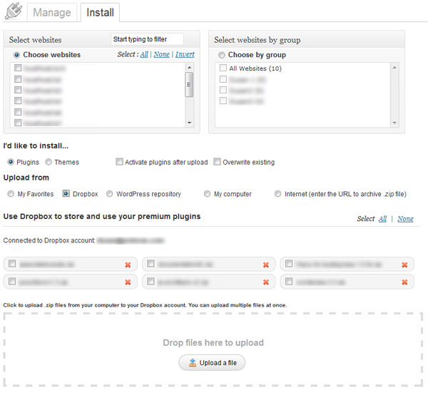 We already offer numerous ways to install plugins and themes on your websites, but we have now added yet another one. Once you have authorized ManageWP with your Dropbox account, you’ll be able to store your favorite plugins and themes on your Dropbox account. Dropbox is now also listed as an installation source for all your sites.
