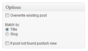 Instead of publishing new posts or pages, we have provided a new option to bulk overwrite existing posts or pages with fresh, new content. You can choose to check for existing posts/pages by post title or slug, or you can choose if you want to publish a new post if that post doesn’t yet exist.