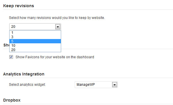 From your general settings page, you are now able to specify how many previous post revisions you would like to keep on your sites. This means that ManageWP will only show up to the number of revisions for the specified number on a per website basis. This number also applies on clearing your post revisions, so only the revisions above the specified number will be cleared.