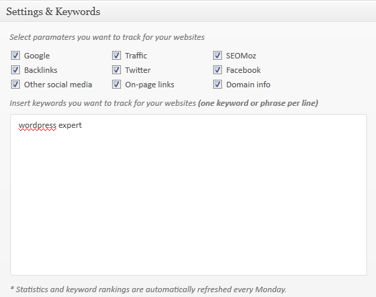 You can also enter keywords that you want to track and we will find out the Google rankings for them as well display the history of the rankings in a chart.